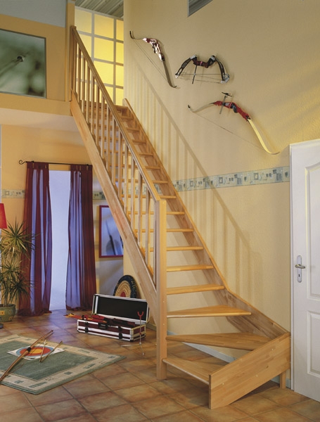 Velmi elegantní dřevěné schodiště se zatočením bez podschodnic smrk